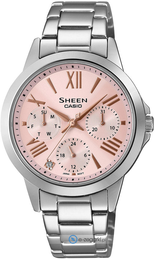 Zegarek damski SHE-3516D-4AUEF marki Casio to stylowe połączenie funkcjonalności oraz modnego designu. Model ten należy do serii Casio Sheen. Charakterystyczny wygląd zegarka uzyskano również dzięki tarczy w kolorze różowym. Zegarek ten pokazuje aktualny czas w formacie analogowym dzięki temu odczyt jest bardzo łatwy. Koperta jest w kolorze srebrnym szeroka jest na 35 mm oraz ma grubość 8 mm - wyróżnia się okrągłym kształtem.