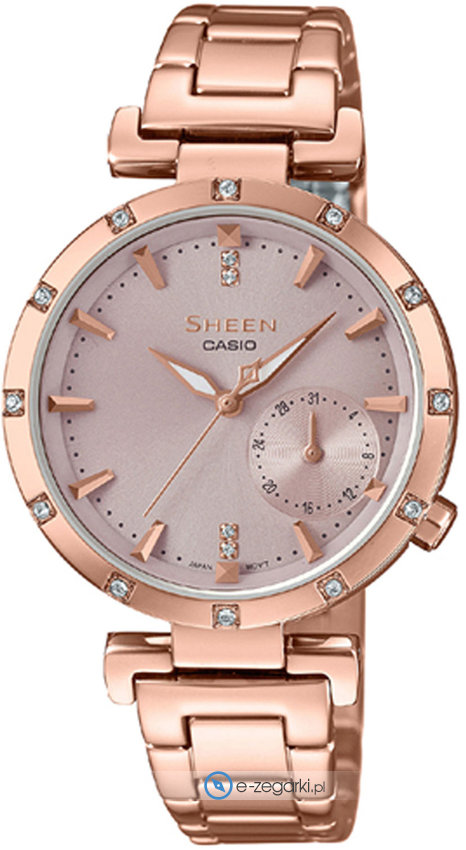 Zegarek damski SHE-4051PG-4AUER należy do serii Casio Sheen marki Casio. Zaprezentowana metodą analogową bieżąca godzina jest czytelna i szybka do odczytania. Koperta szeroka jest na 32 mm oraz ma grubość 8.69 mm - wyróżnia się okrągłym kształtem.