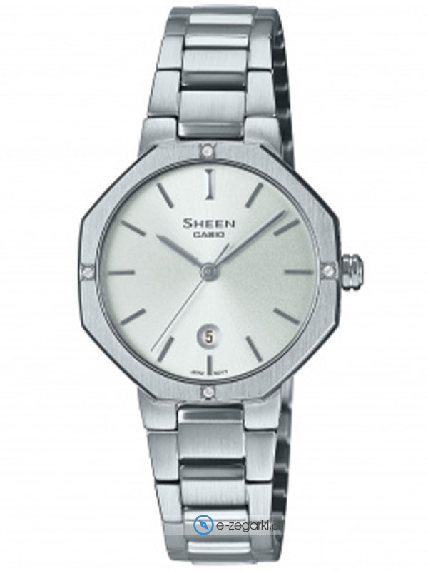 Model damski SHE-4543D-7AUER marki Casio z serii Casio Sheen. Nieschematyczny wygląd zegarka uzyskano również dzięki tarczy w kolorze srebrnym. Godzina przedstawiona jest w sposób analogowy co intuicyjnie pozwala ją odczytać. Koperta jest w kolorze srebrnym szeroka jest na 28 mm oraz ma grubość 6 mm - w kształcie okrągłym.