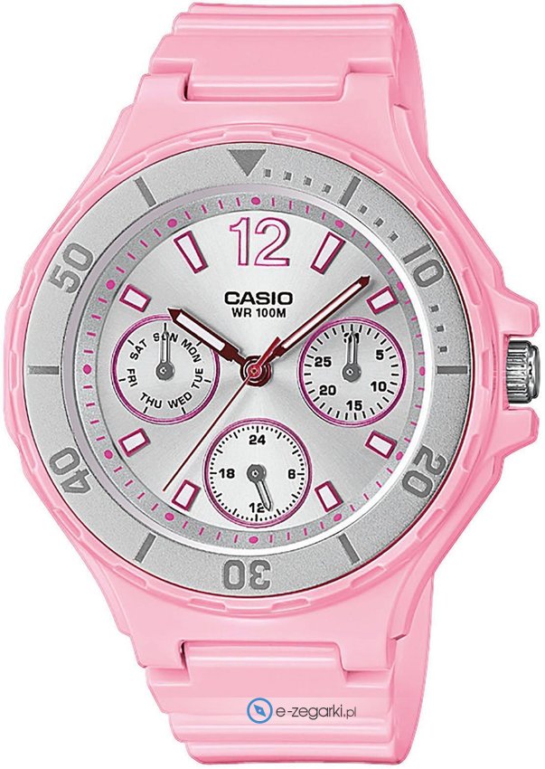 Kwarcowa bateria umieszczona w modelu LRW-250H-4A2VEF zapewnia zasilanie jego mechanizmu. Pasek różowego koloru wykonany jest z wysokiej jakości tworzywa sztucznego.