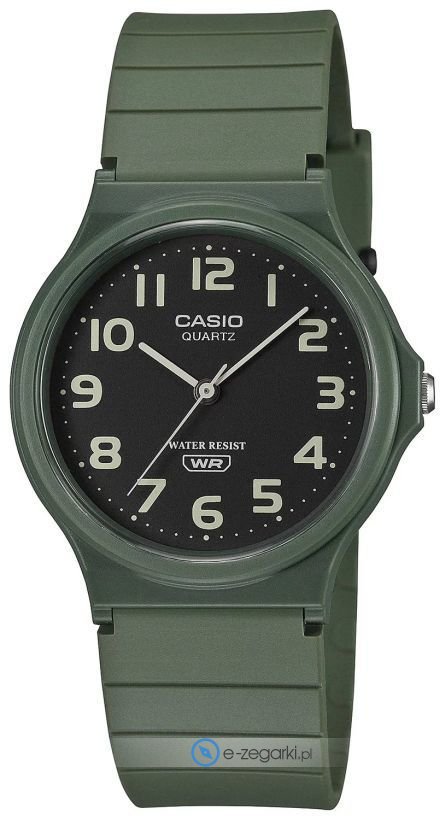 Zegarek MQ-24UC-3BEF wyposażony jest w mechanizm zasilany normalną baterią kwarcową. Pasek koloru zielonego wykonany jest z wysokiej jakości tworzywa sztucznego.