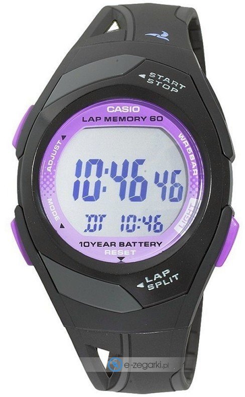 Damski zegarek STR-300-1CEG z kolekcji Casio Sports marki Casio to połączenie smaku i pomysłowych funkcji. Charakterystyczny wygląd zegarka osiągnięto także dzięki tarczy w kolorze fioletowym. Pokazana metodą cyfrową bieżąca godzina jest czytelna i prosta do odczytania. Koperta w barwach koloru czarnego szeroka jest na 35 mm oraz ma grubość 12 mm - w kształcie okrągłym.