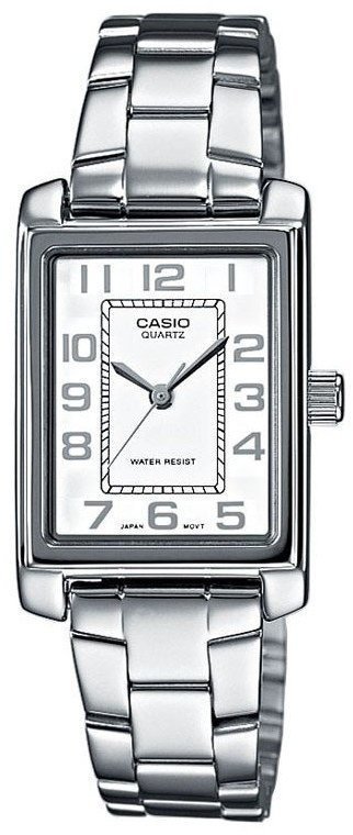 Zegarek damski LTP-1234D-7B marki Casio należy do kolekcji Casio Standard Analogue. Wysokiej trwałości tarczę zegarka ozdobiono jasnym kolorem. Zaprezentowana metodą analogową bieżąca godzina jest czytelna i szybka do sprawdzenia. Koperta szeroka jest na 21 mm oraz ma grubość 7 mm - w kształcie prostokątnym.