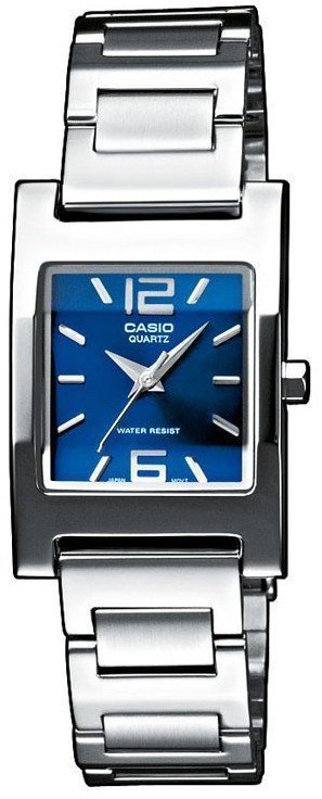 Zegarek LTP-1283D-2A2EF marki Casio to gustowny zegarek naręczny damski, który jest wyposażony w ciekawe rozwiązania i funkcje. Model ten występuje w kolekcji Casio Standard Analogue. Niebanalny wygląd zegarka uzyskano również dzięki tarczy w kolorze niebieskim. Godzina przedstawiona jest w sposób analogowy co niezmiernie łatwo pozwala ją odczytać. Koperta została pokryta kolorem srebrnym szeroka jest na 20 mm oraz ma grubość 8 mm - cechuje się prostokątnym kształtem.