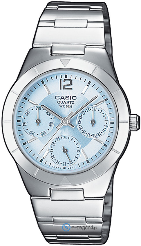 Zegarek damski LTP-2069D-2AV marki Casio należy do kolekcji Casio Standard Analogue. Styl zapewnia wysokiej klasy cyferblat w kolorze niebieskim. Pokazana metodą analogową aktualna godzina jest czytelna i szybka do odczytania. Koperta jest w kolorze srebrnym szeroka jest na 31 mm oraz ma grubość 8 mm - cechuje się okrągłym kształtem.