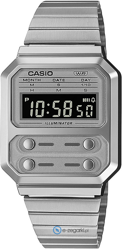 Zegarek damski A100WE-7BEF należy do serii Casio Vintage marki Casio. Charakter zapewnia wysokiej klasy tarcza w kolorze szarym. Pokazana metodą cyfrową aktualna godzina jest czytelna i prosta do odczytania. Koperta w barwach koloru szarego szeroka jest na 33 mm oraz ma grubość 9 mm - wyróżnia się prostokątnym kształtem.