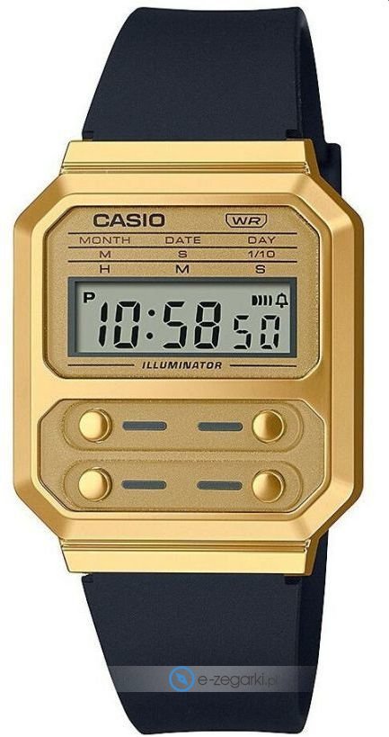 Zegarek damski A100WEFG-9AEF marki Casio to dobre połączenie funkcjonalności oraz ciekawego wzornictwa. Model ten w gamie innych zegarków tego producenta występuje w serii Casio Vintage. Wysokiej jakości cyferblat zegarka ozdobiono złotym kolorem. Aktualna godzina prezentowana jest w sposób cyfrowy co niezmiernie łatwo pozwala ją odczytać. Koperta jest ozdobiona kolorem złotym szeroka jest na 33 mm oraz ma grubość 9 mm - w kształcie prostokątnym.