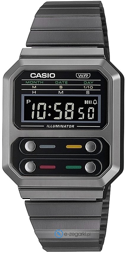 Zegarek A100WEGG-1AEF zasilany jest za pomocą baterii kwarcowej. Wytrzymała bransoleta koloru szarego wytworzona ze stali nierdzewnej zapewnia powyższoną jakość oraz trwałość.