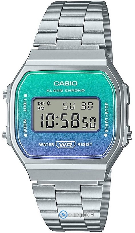 Damski zegarek A168WER-2AEF z kolekcji Casio Vintage marki Casio to połączenie smaku oraz oryginalnych funkcji. Ciekawy wygląd czasomierza uzyskano również dzięki tarczy w kolorze niebieskim. Godzina pokazywana jest w sposób cyfrowy co niezmiernie łatwo pozwala ją odczytać. Koperta została pokryta kolorem srebrnym szeroka jest na 36 mm oraz ma grubość 10 mm.