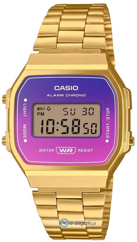 Zegarek A168WERG-2AEF marki Casio to stylowy zegarek naręczny damski, który wyposażono w pomysłowe rozwiązania i funkcje. Model ten jest z serii Casio Vintage. Wysokiej trwałości tarczę zegarka ozdobiono fioletowym kolorem. Zegarek ten pokazuje godzinę w formacie cyfrowym dzięki temu odczyt jest intuicyjny. Koperta jest w kolorze złotym szeroka jest na 36 mm oraz ma grubość 10 mm.