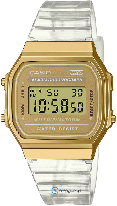 Zegarek damski A168XESG-9AEF marki Casio to dobre połączenie funkcjonalności a także ciekawego designu. Model ten w gamie innych zegarków tego producenta występuje w kolekcji Casio Vintage. Charakterystyczny wygląd zegarka uzyskano również dzięki tarczy w kolorze złotym. Godzina zaprezentowana jest w sposób cyfrowy co intuicyjnie pozwala ją odczytać. Koperta jest pokryta kolorem złotym szeroka jest na 35 mm oraz ma grubość 10 mm.