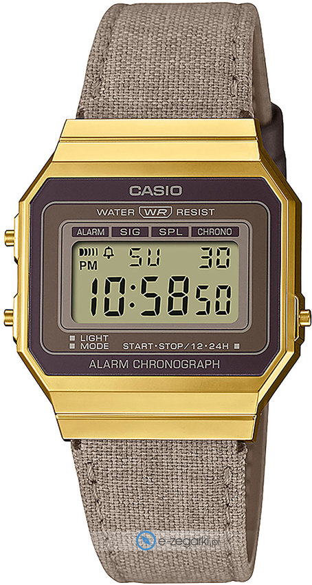 Damski zegarek A700WEGL-5AEF z kolekcji Casio Vintage marki Casio to połączenie smaku oraz nieprzeciętnych mechanizmów. Atrakcyjną konstrukcję zegarka osiągnięto dzięki tarczy w kolorze brązowym. Zegarek ten prezentuje aktualny czas w formacie cyfrowym dzięki temu odczyt jest bezproblemowy. Koperta jest pokryta kolorem złotym szeroka jest na 35 mm oraz ma grubość 6 mm - w kształcie prostokątnym.