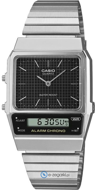 Zegarek AQ-800E-1A marki Casio to stylowy zegarek naręczny damski, który wyposażono w ciekawe rozwiązania i funkcje. Model ten pochodzi z kolekcji Casio Vintage. Tarcza zegarka jest w kolorze czarnym. Zegarek ten prezentuje godzinę w formacie analogowo - cyfrowym dzięki temu odczyt jest bardzo łatwy. Koperta jest w kolorze srebrnym szeroka jest na 32 mm oraz ma grubość 9 mm - posiada prostokątny kształt.