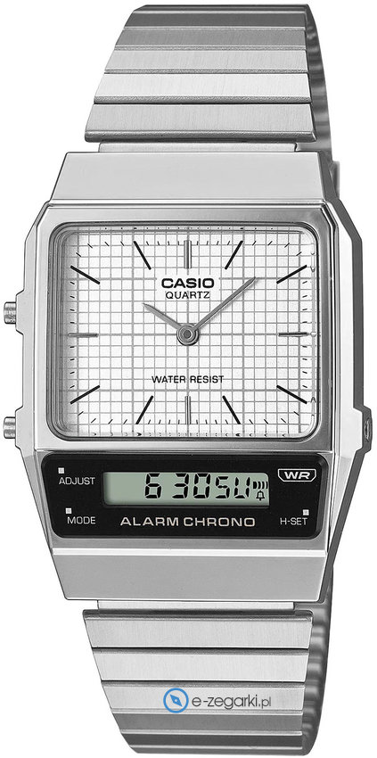 Model damski AQ-800E-7AEF z kolekcji Casio Vintage marki Casio. Styl zapewnia wysokiej klasy cyferblat w kolorze białym. Zegarek ten pokazuje aktualny czas w formacie analogowo - cyfrowym dzięki temu odczyt jest bezproblemowy. Koperta w barwach koloru srebrnego szeroka jest na 32 mm oraz ma grubość 9 mm - charakteryzuje się prostokątnym kształtem.