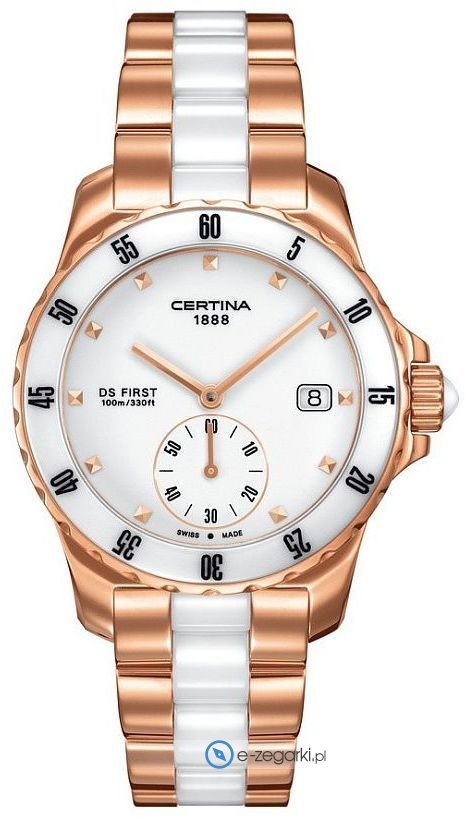 Zegarek Certina C014.235.33.011.00 to czasomierz z mechanizmem kwarcowym, zapewniającym precyzję i niezawodność. Okrągła koperta w kolorze różowego złota, o szerokości 35 mm, idealnie pasuje na kobiecy nadgarstek, nadając mu subtelności i biżuteryjnego charakteru. Bransoleta wykonana ze stali nierdzewnej z elementami ceramicznymi, zapewnia trwałość i komfort noszenia. Zegarek posiada szafirowe szkiełko, które jest odporne na zarysowania, co gwarantuje doskonały wygląd przez długi czas. Jeśli szukasz idealnego prezentu, pomyśl o możliwości personalizacji. Grawer uczyni ten zegarek wyjątkowym.