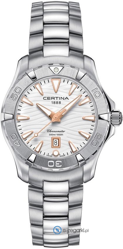 Zegarek damski C032.251.11.011.01 marki Certina to dobra pozycja dla ludzi ceniących sobie dbałość o szczegóły oraz bezproblemowe zachowanie mechanizmów. Charakter zapewnia wysokiej jakości cyferblat w kolorze białym. Zegarek ten pokazuje godzinę w formacie analogowym dzięki czemu odczyt jest intuicyjny. Koperta w barwach koloru szarego szeroka jest na 34 mm oraz ma grubość 10 mm - charakteryzuje się okrągłym kształtem.