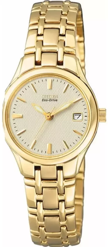 Zegarek EW1262-55P posiada autorski mechanizm Citizen Eco-Drive zasilany jakimkolwiek źródłem światła. Wytrzymała bransoleta złotego koloru wytworzona ze stali nierdzewnej zapewnia wysoką jakość oraz trwałość.