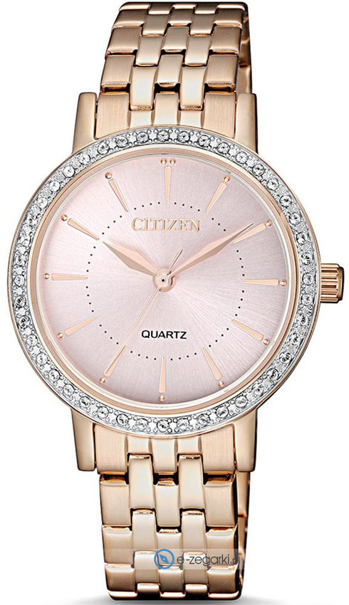 Zegarek damski EL3043-81X marki Citizen to stylowe połączenie funkcjonalności oraz modnego wzornictwa. Model ten zalicza się do serii Citizen Elegance. Tarcza zegarka jest w kolorze różowym. Zegarek ten pokazuje aktualny czas w formacie analogowym dzięki temu odczyt jest bardzo łatwy. Koperta jest w kolorze złotym szeroka jest na 31 mm oraz ma grubość 7 mm - charakteryzuje się okrągłym kształtem.