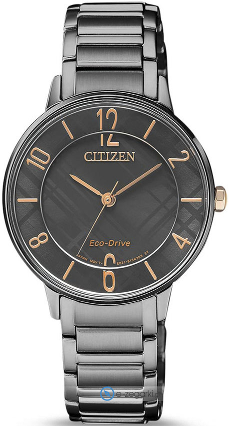 Zegarek EM0528-82H został wyposażony w autorski mechanizm Citizen Eco-Drive zasilany dowolnym źródłem światła. Wytrzymała bransoleta jest w kolorze czarnym wykonana ze stali nierdzewnej zapewnia wysoką jakość oraz trwałość.