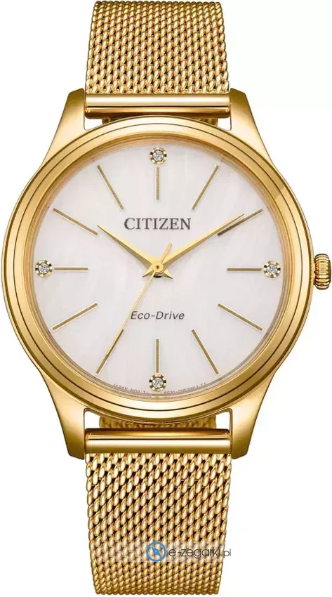 Zastosowano tutaj opatentowany mechanizm Citizen Eco-Drive dzięki czemu zegarek EM1222-87A jest zasilany dowolnym źródłem światła. Odporna na korozję oraz oddziaływanie czynników atmosferycznych bransoleta koloru złotego cechuje się jakością, a także trwałością.