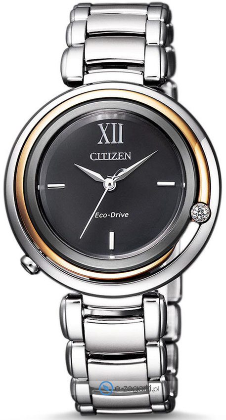 Model damski EM0658-87E marki Citizen z rodziny Citizen L. Cyferblat zegarka jest w kolorze czarnym. Aktualna godzina zaprezentowana jest w sposób analogowy co intuicyjnie pozwala ją odczytać. Koperta jest w kolorze stalowym szeroka jest na 32 mm oraz ma grubość 7 mm - cechuje się okrągłym kształtem.