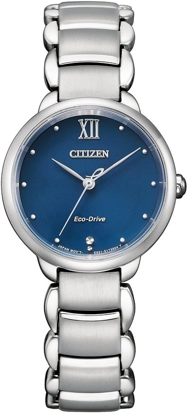 Model damski EM0920-86L z rodziny Citizen L marki Citizen. Wysokiej trwałości cyferblat zegarka pokryto niebieskim kolorem. Zaprezentowana metodą analogową bieżąca godzina jest czytelna i łatwa do sprawdzenia. Koperta jest w kolorze srebrnym szeroka jest na 28 mm oraz ma grubość 8 mm - wyróżnia się okrągłym kształtem.