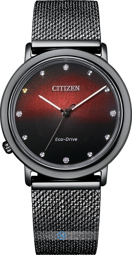 Citizen EM1007-47E - damski zegarek przeznaczony dla osób szukających zegarka z serii Citizen L. Niebanalny wygląd czasomierza osiągnięto także dzięki tarczy w kolorze czerwonym. Aktualna godzina pokazywana jest w sposób analogowy co niezmiernie łatwo pozwala ją odczytać. Koperta jest w kolorze czarnym szeroka jest na 34 mm oraz ma grubość 7 mm - posiada okrągły kształt.