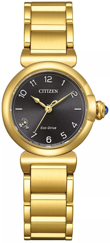Citizen EM1132-88H to damski zegarek kierowany dla osób szukających zegarka z kolekcji Citizen L. Charakter zapewnia wysokiej klasy cyferblat w kolorze czarnym. Zegarek ten pokazuje aktualny czas w formacie analogowym dzięki temu odczyt jest bezproblemowy. Koperta w odcieniach koloru złotego szeroka jest na 26 mm oraz ma grubość 8 mm - charakteryzuje się okrągłym kształtem.