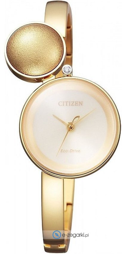 Zegarek damski EW5495-55P marki Citizen to stylowe połączenie funkcjonalności a także ciekawego designu. Model ten w gamie innych zegarków tego producenta występuje w serii Citizen L. Charakterystyczny wygląd czasomierza osiągnięto m.in. poprzez tarczę w kolorze złotym. Zegarek ten pokazuje aktualny czas w formacie analogowym dzięki czemu odczyt jest bardzo łatwy. Koperta jest w kolorze złotym szeroka jest na 25 mm - posiada okrągły kształt.