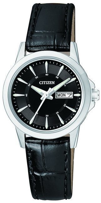 Zegarek damski EQ0601-03EE marki Citizen to idealne połączenie funkcjonalności a także ciekawego designu. Model ten zalicza się do serii Citizen Leather. Niebanalny wygląd zegarka uzyskano m.in. poprzez cyferblat w kolorze czarnym. Zegarek ten pokazuje godzinę w formacie analogowym dzięki czemu odczyt jest bezproblemowy. Koperta w odcieniach koloru stalowego szeroka jest na 28 mm oraz ma grubość 8 mm - ma okrągły kształt.