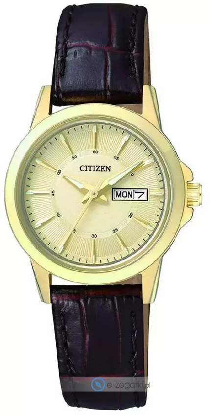 Zegarek damski EQ0603-08PE marki Citizen należy do rodziny Citizen Leather. Tarcza zegarka jest w kolorze złotym. Aktualna godzina zaprezentowana jest w sposób analogowy co intuicyjnie pozwala ją odczytać. Koperta jest w kolorze złotym szeroka jest na 28 mm oraz ma grubość 8 mm - w kształcie okrągłym.