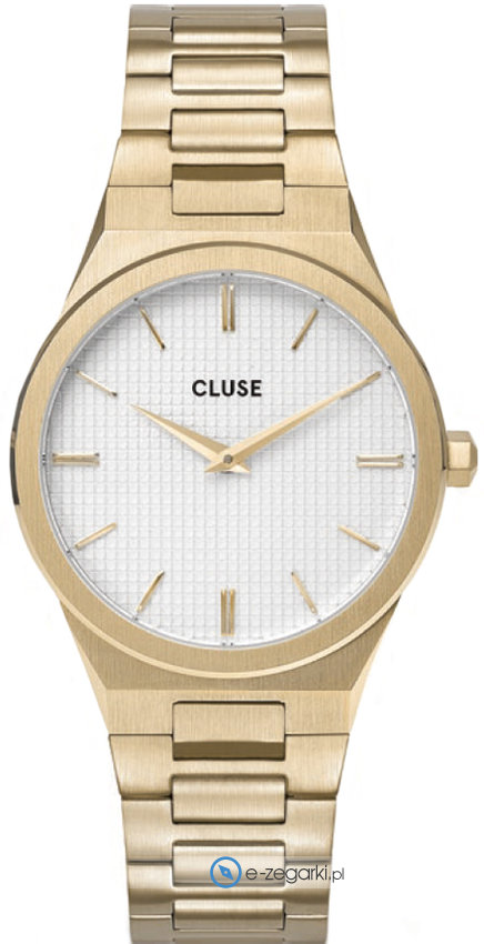 Model CW0101210002 marki Cluse to elegancki zegarek naręczny damski, który posiada ciekawe rozwiązania oraz funkcje. Ciekawy wygląd zegarka uzyskano m.in. poprzez cyferblat w kolorze białym. Zegarek ten prezentuje godzinę w formacie analogowym dzięki czemu odczyt jest bezproblemowy. Koperta w odcieniach koloru złotego szeroka jest na 33 mm oraz ma grubość 8 mm - posiada okrągły kształt.