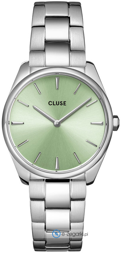 Zegarek damski CW11215 marki Cluse to idealne połączenie funkcjonalności oraz ciekawego designu. Model ten w gamie innych zegarków tego producenta występuje w serii Cluse Feroce Petite. Ciekawy wygląd czasomierza osiągnięto m.in. poprzez tarczę w kolorze zielonym. Pokazana metodą analogową bieżąca godzina jest czytelna i łatwa do odczytania. Koperta jest w kolorze srebrnym szeroka jest na 32 mm oraz ma grubość 8 mm - posiada okrągły kształt.