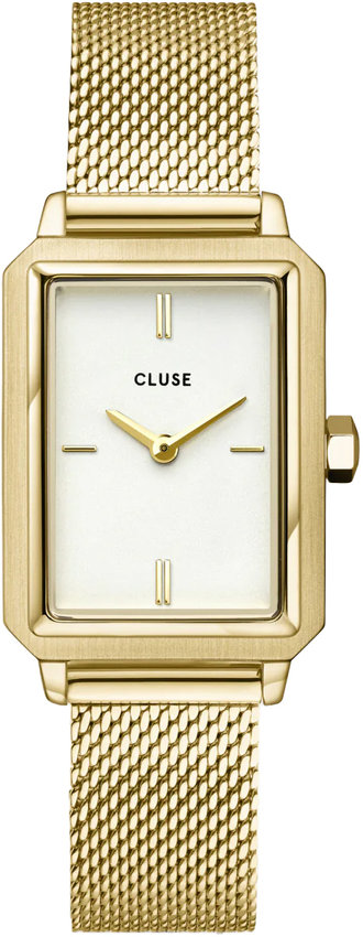 Model damski CG11505 marki Cluse z kolekcji Cluse Fluette. Tarcza zegarka jest w kolorze białym. Pokazana metodą analogową aktualna godzina jest czytelna i prosta do sprawdzenia. Koperta została ozdobiona kolorem złotym szeroka jest na 31 mm oraz ma grubość 7 mm - charakteryzuje się prostokątnym kształtem.