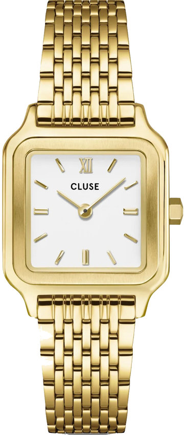 Zegarek damski CG11804 z serii Cluse Gracieuse marki Cluse. Niebanalną konstrukcję czasomierza uzyskano dzięki tarczy w kolorze białym. Zegarek ten prezentuje godzinę w formacie analogowym dzięki temu odczyt jest bezproblemowy. Koperta została ozdobiona kolorem złotym szeroka jest na 24 mm - w kształcie prostokątnym.
