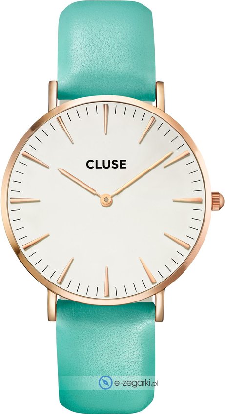 Model damski CL18013 zalicza się do kolekcji Cluse La Boheme marki Cluse. Cyferblat zegarka jest w kolorze białym. Pokazana metodą analogową bieżąca godzina jest czytelna i prosta do odczytania. Koperta jest ozdobiona kolorem różowo złotym szeroka jest na 33 mm oraz ma grubość 8 mm - posiada okrągły kształt.