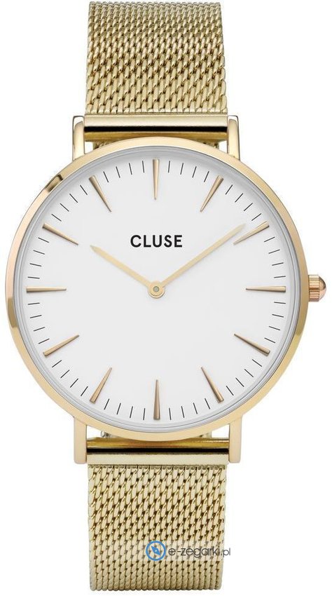 Zegarek damski CL18109 z rodziny Cluse La Boheme marki Cluse. Niestereotypowy wygląd czasomierza uzyskano m.in. poprzez tarczę w kolorze jasnym. Godzina przedstawiona jest w sposób analogowy co bez trudu pozwala ją odczytać. Koperta jest pokryta kolorem złotym szeroka jest na 38 mm oraz ma grubość 7 mm - charakteryzuje się okrągłym kształtem.