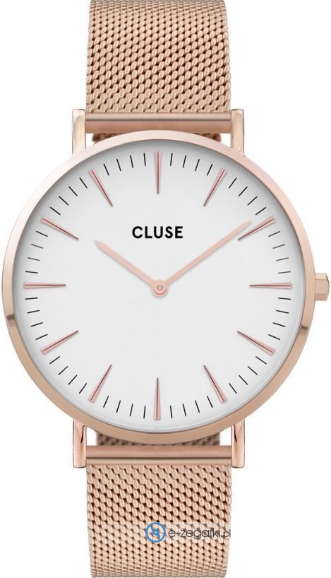 Zegarek damski CW0101201001 marki Cluse należy do kolekcji Cluse La Boheme. Wysokiej jakości tarczę zegarka pokryto białym kolorem. Godzina przedstawiona jest w sposób analogowy co niezmiernie łatwo pozwala ją odczytać. Koperta jest w kolorze różowo złotym szeroka jest na 38 mm oraz ma grubość 7 mm - w kształcie okrągłym.