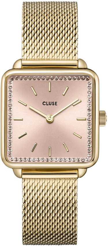 Zegarek damski CG10322 marki Cluse to dobre połączenie funkcjonalności oraz modnego wzornictwa. Model ten występuje w kolekcji Cluse La Tetragone. Cyferblat zegarka jest w kolorze różowym. Godzina pokazywana jest w sposób analogowy co bez trudu pozwala ją odczytać. Koperta w odcieniach koloru złotego szeroka jest na 29 mm oraz ma grubość 7 mm.