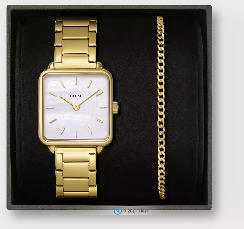 Zegarek CG10327 marki Cluse to elegancki zegarek naręczny damski, który posiada pomysłowe rozwiązania oraz funkcje. Model ten należy do serii, którą możesz odkryć tutaj: Cluse La Tetragone. Niebanalną konstrukcję zegarka osiągnięto z pomocą tarczy w kolorze perłowym. Zegarek ten pokazuje aktualny czas w formacie analogowym dzięki temu odczyt jest bezproblemowy. Koperta jest w kolorze złotym szeroka jest na 28 mm oraz ma grubość 7 mm.