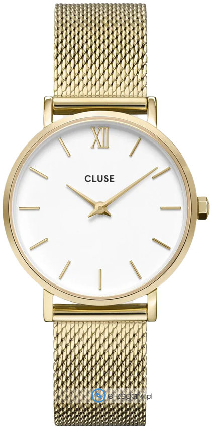 Zegarek CG10212 marki Cluse to stylowy zegarek naręczny damski, który jest wyposażony w pomysłowe rozwiązania oraz funkcje. Model ten zalicza się do serii Cluse Minuit. Cyferblat zegarka jest w kolorze białym. Godzina pokazywana jest w sposób analogowy co niezmiernie łatwo pozwala ją odczytać. Koperta jest w kolorze złotym szeroka jest na 33 mm oraz ma grubość 7 mm - posiada okrągły kształt.