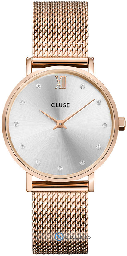 Zegarek damski CW10205 marki Cluse z kolekcji Cluse Minuit. Niebanalną stylistykę czasomierza uzyskano z pomocą tarczy w kolorze srebrnym. Zegarek ten prezentuje aktualny czas w formacie analogowym dzięki czemu odczyt jest intuicyjny. Koperta została pokryta kolorem różowo złotym szeroka jest na 33 mm oraz ma grubość 8 mm - charakteryzuje się okrągłym kształtem.