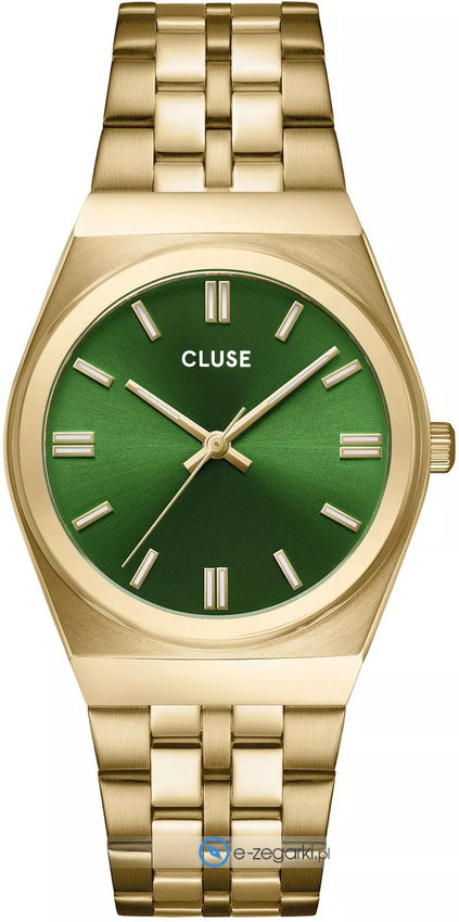 Zegarek CW35105 marki Cluse to gustowny zegarek naręczny damski, który wyposażono w pomysłowe rozwiązania i funkcje. Model ten należy do serii Cluse Retro 70s. Ciekawy wygląd czasomierza osiągnięto m.in. poprzez tarczę w kolorze zielonym. Pokazana metodą analogową aktualna godzina jest czytelna i łatwa do sprawdzenia. Koperta jest ozdobiona kolorem złotym szeroka jest na 33 mm oraz ma grubość 8 mm - cechuje się okrągłym kształtem.