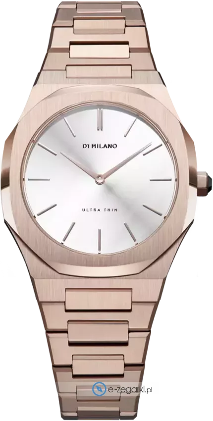 Zegarek damski UTBL09 marki D1 Milano to ciekawa propozycja dla osób ceniących sobie dbałość o szczegóły oraz sprawne zachowanie mechanizmów. Ciekawą konstrukcję czasomierza uzyskano z pomocą tarczy w kolorze białym. Aktualna godzina przedstawiona jest w sposób analogowy co bez trudu pozwala ją odczytać. Koperta jest w kolorze różowo złotym szeroka jest na 34 mm oraz ma grubość 6 mm.
