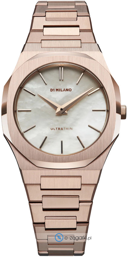 Zegarek damski UTBL20 marki D1 Milano to stylowe połączenie funkcjonalności i modnego designu. Stylu nadaje wysokiej jakości cyferblat w kolorze białym. Pokazana metodą analogową bieżąca godzina jest czytelna i szybka do sprawdzenia. Koperta jest w kolorze różowo złotym szeroka jest na 34 mm oraz ma grubość 6 mm.