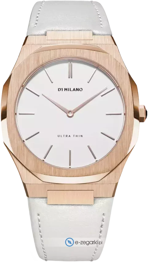 Zegarek damski UTLL02 marki D1 Milano to idealna propozycja dla osób ceniących sobie dbałość o szczegóły oraz sprawne działanie mechanizmów. Cyferblat zegarka jest w kolorze białym. Zegarek ten pokazuje aktualny czas w formacie analogowym dzięki temu odczyt jest bardzo łatwy. Koperta jest w kolorze różowo złotym szeroka jest na 38 mm oraz ma grubość 6 mm.