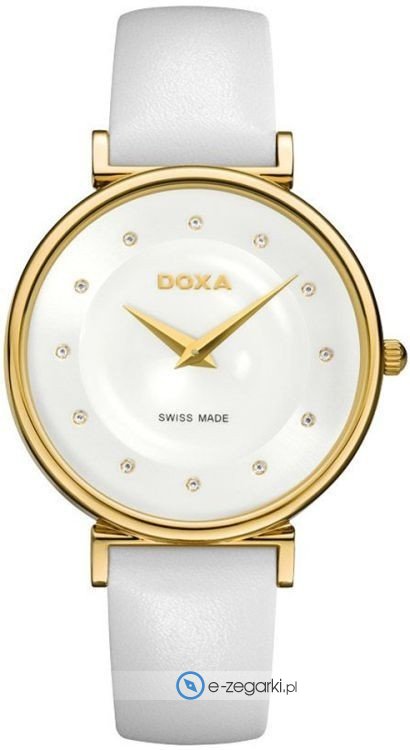 Zegarek damski 145.35.058.07 marki Doxa to stylowe połączenie funkcjonalności oraz ciekawego wzornictwa. Charakterystyczny wygląd zegarka osiągnięto także dzięki tarczy w kolorze białym. Godzina prezentowana jest w sposób analogowy co intuicyjnie pozwala ją odczytać. Koperta w odcieniach koloru złotego szeroka jest na 36 mm oraz ma grubość 8 mm - w kształcie okrągłym.