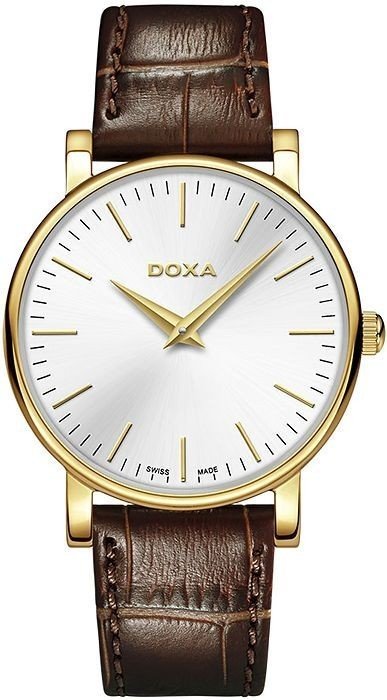 Zegarek damski 173.35.021.02 marki Doxa to dobra propozycja dla ludzi ceniących sobie dbałość o szczegóły oraz bezproblemowe funkcjonowanie mechanizmów. Cyferblat zegarka jest w kolorze srebrnym. Pokazana metodą analogową aktualna godzina jest czytelna i prosta do odczytania. Koperta w barwach koloru złotego szeroka jest na 32 mm oraz ma grubość 7 mm - posiada okrągły kształt.