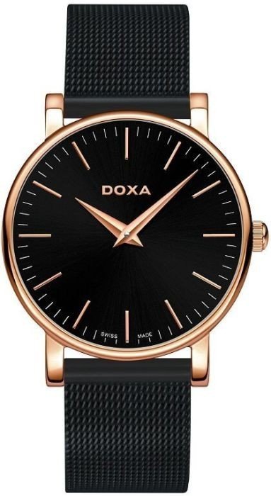 Zegarek damski 173.95.101M.15 marki Doxa to idealna pozycja dla ludzi ceniących sobie dbałość o detale oraz bezproblemowe funkcjonowanie mechanizmów. Charakteru nadaje wysokiej jakości cyferblat w kolorze czarnym. Zegarek ten prezentuje aktualny czas w formacie analogowym dzięki czemu odczyt jest intuicyjny. Koperta jest w kolorze różowo złotym szeroka jest na 32 mm oraz ma grubość 7 mm - w kształcie okrągłym.