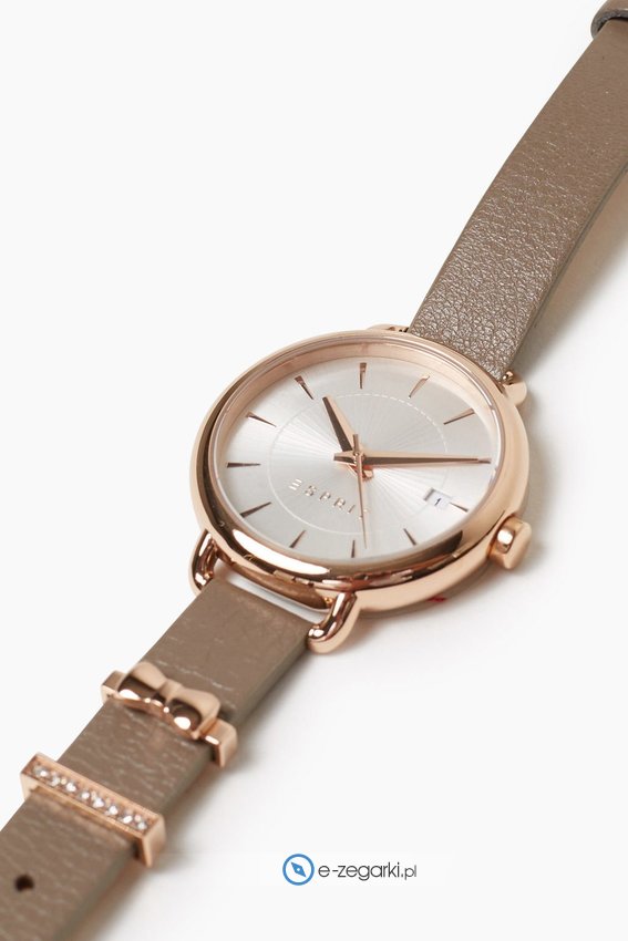 Kwarcowa bateria zamontowana w modelu ES109402003 zapewnia zasilanie jego mechanizmu. Pasek wykonany jest z wysokiej klasy skóry gwarantującej trwałość i komfort noszenia.